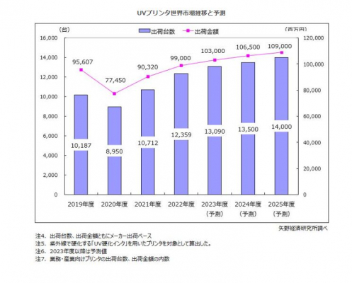 多様な用途、速乾性、幅広い製品ラインナップなどがユーザー企業に支持されており、国内の主要メーカーのいずれも、世界市場において順調に出荷台数を伸ばしている。2022年度のUVプリンタの世界出荷台数*は前年度比115.4%の1万2,359台、出荷金額*は同109.6%の990億円となった。2023年度以降はラテックスプリンタなど、低VOCで環境に配慮した他製品の伸長もあり、市場の伸び幅は小さくなると考えるが、今後も成長は続いていくと予測する。