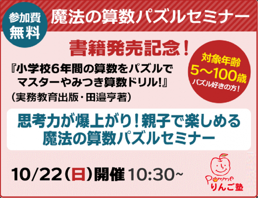 「りんご塾」代表で、今やベストセラーパズル作家でもある田邉亨氏の新刊『小学校6年間の算数をパズルでマスター!やみつき算数ドリル ふつう/やさしめ』(実務教育出版)が、2023年9月25日(月)に発売されました。発売を記念して、10月22日(日)に、実務教育出版とのコラボレーションイベントとなる特別セミナーを開催します。