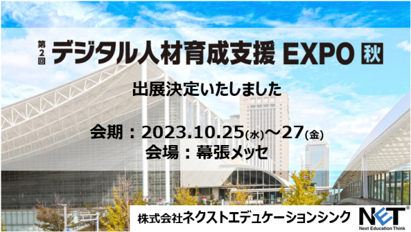 デジタル人財育成を、「各種デジタル人財アセスメント」や「DX検定(TM)シリーズ」「組織分析・コンサルティング」等を通じ積極的に支援している株式会社ネクストエデュケーションシンクは、 「第2回 デジタル人材育成支援EXPO 秋」に出展し、新しい各種ソリューションを発表・展示することを発表しました。
