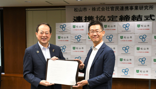 「善き前例をともにつくる」を経営理念とする株式会社官民連携事業研究所(本社:大阪府四條畷市、代表取締役社長:鷲見 英利、以下「官民連携事業研究所」)は、2023年10月2日、愛媛県松山市(市長:野志 克仁)と「官民連携促進に関する連携協定」を締結しました。官民連携事業研究所としては、今回が42自治体目の連携協定です。本協定を通じて松山市の様々な課題解決や地域の持続的発展に寄与する官民連携を促進していきます。