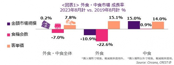 外食・中食市場の2023年8月は、売上0.2%増(2019年同月比)