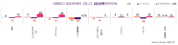 業態別・利用形態別の2023年8月の売上2019年同月比をみると(図表2)、外食・中食全体のイートインは10.9%減と前月と同水準でした(前月比0.3ポイント増)。テイクアウト・出前は15.0%増で、ファストフード+セルフサービスカフェ(同60%増)、ファミリーレストラン(同48%増)が好調でした。