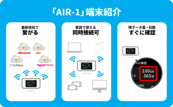 「AIR-1」は、最新の通信技術クラウドSIMを実装したモバイルWi-Fiルーターです。利用環境に応じて、ドコモ・au・ソフトバンク・楽天モバイルの4キャリアの中から最適な回線を自動で選び、通信接続するため、日本全国繋がりやすくなっております。