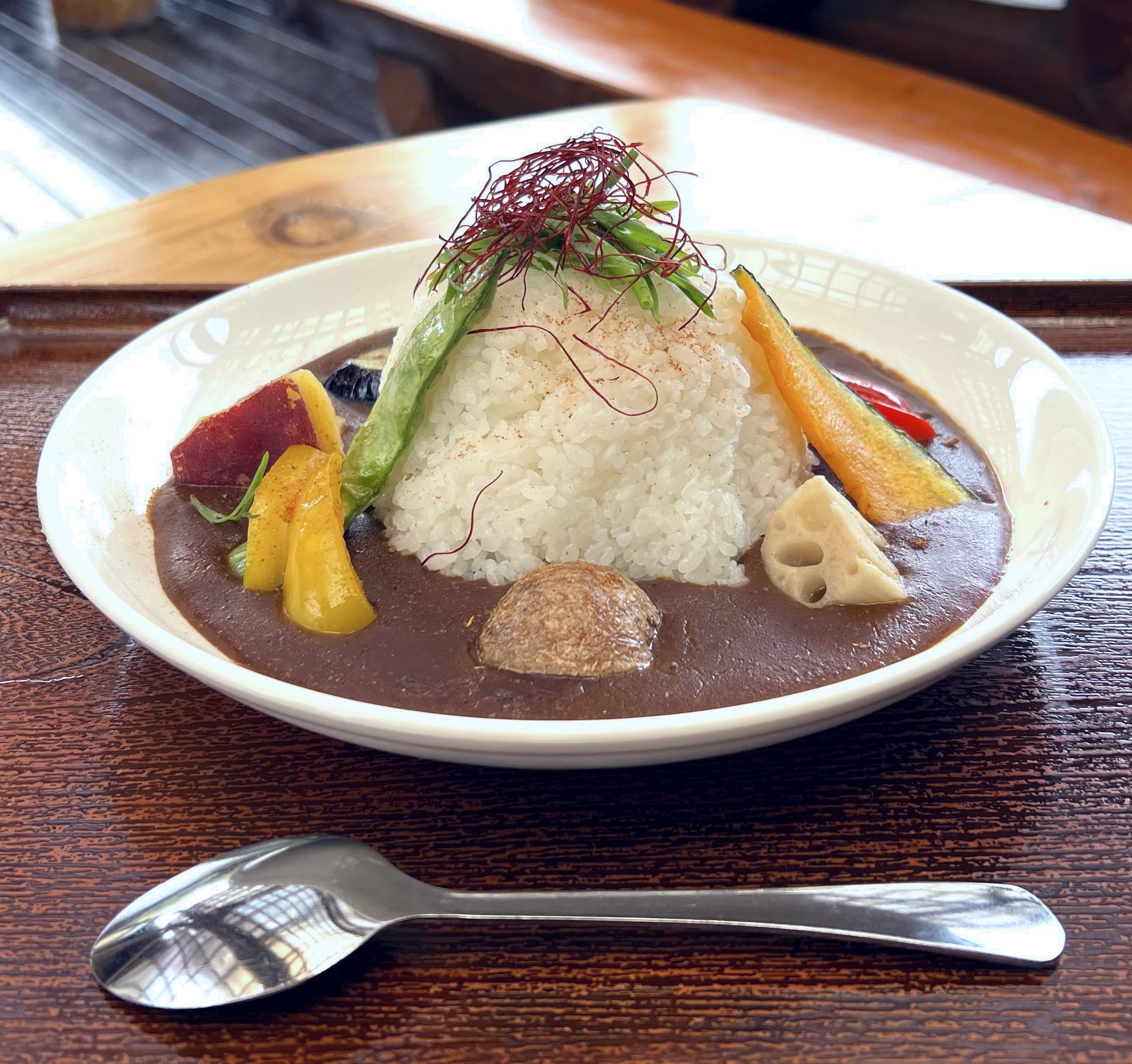 七山特産の特裁米コシヒカリの浮岳の周りに、香り豊かな14種類の香辛料を含むジャークスパイスをじっくり練り込んだカレールー、七山特産のパプリカやナス、モロッコインゲン、カボチャ、糸胡椒等々、素揚げした新鮮野菜をトッピング。さらにボビーズブレンドのジャークスパイスをまぶし、カレーファン待望の辛口。