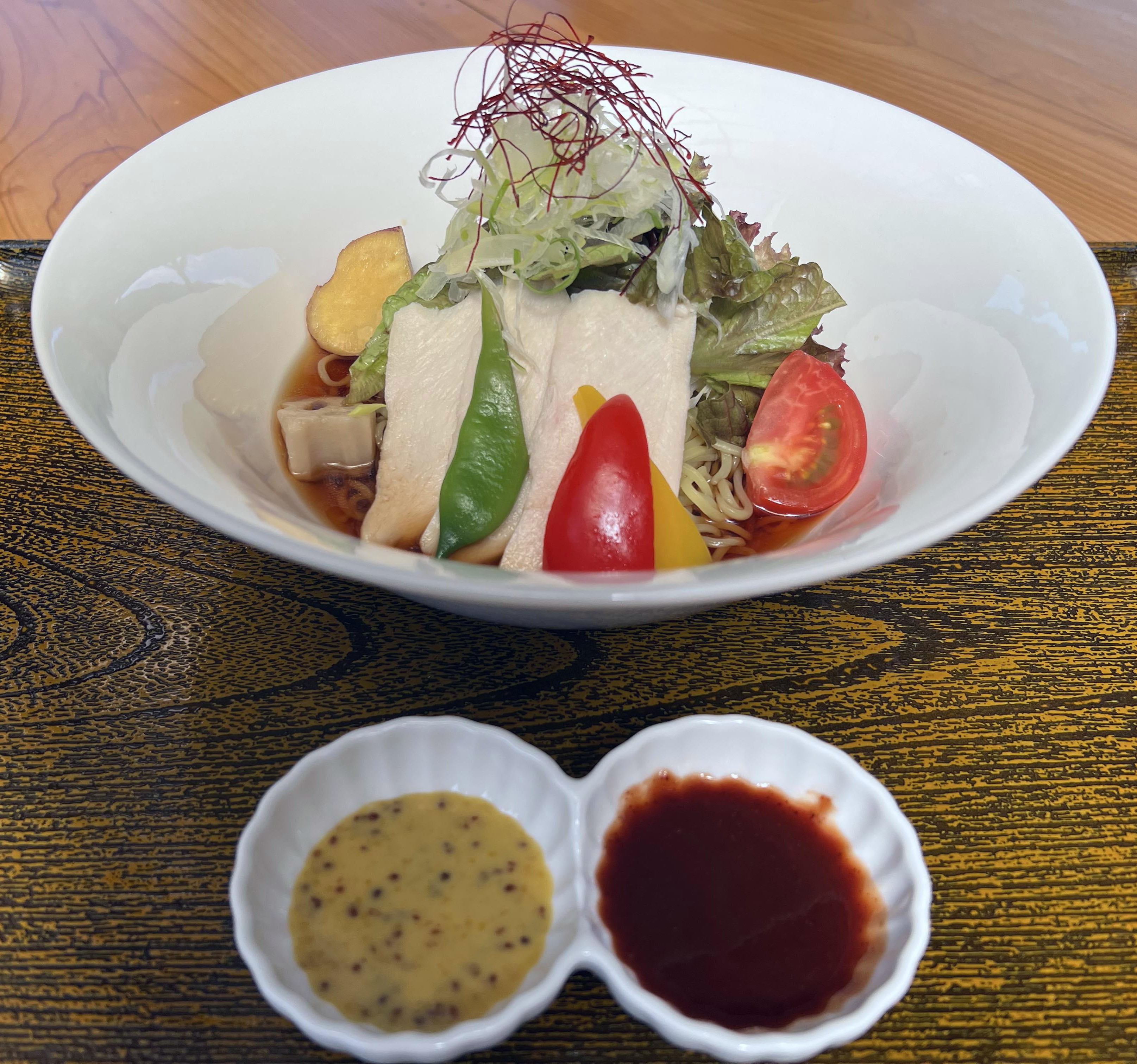 ななのゆ特製の和風出汁をベースに、スライスした蒸し鶏のムネ肉と、新鮮な七山野菜を盛り付けたヘルシーなサラダ麺です。程よく湯がいた季節の野菜はボビーさん特製のハニーマスタードにディップして食べると甘味と旨味が一気に広がります。