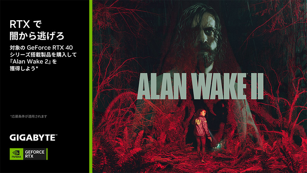2023年10月11日 - GIGABYTE Technology Co., Ltd. 台湾・新北市 - コンピュータテクノロジーで世界をリードするGIGABYTE Technologyは、2023年10月10日~11月13日の期間中、対象のNVIDIA GeForce RTX 40シリーズ搭載製品をご購入いただいたユーザーに、Epic Gamesのサイコロジカルサバイバルホラーゲーム最新作「Alan Wake 2」PC版(2023年10月27発売予定)のゲームクーポンコードをもれなくプレゼントするゲームバンドルキャンペーンを実施いたします。