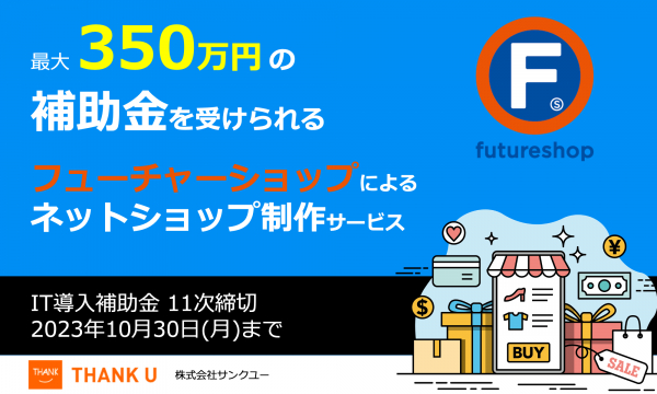 株式会社サンクユー(東京都品川区、代表取締役社長:堀川治)は、2023年10月16日、最大350万円のIT導入補助金の交付申請が可能な「フューチャーショップによるネットショップ制作」11次締切分を開始いたします。