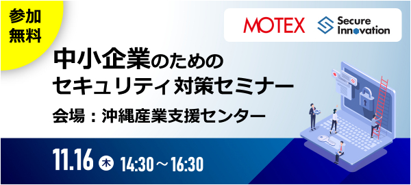 株式会社セキュアイノベーション主催「中小企業のためのセキュリティ対策セミナー」を、沖縄産業支援センターにて2023年11月16日(木)に開催します。