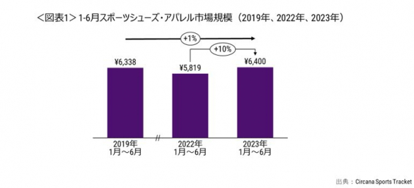 日本の2023年1-6月のスポーツシューズ・アパレル市場規模は6400億円、前年同期比10%増でした(図表1)。2019年同期比は1%増で、コロナ以前の水準も上回りました。