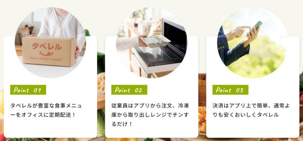 タベレル株式会社は、職場で手軽においしいフードを味わうことができる環境を提供し、社内交流のきっかけも生み出す新サービス「タベレル」を通して、ワーカーの満足度を高め、ハッピーな職場づくりをサポートしてまいります。