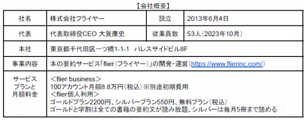 株式会社フライヤーは、本の要約サービス「flier(フライヤー)」を運営する、ITベンチャー(2013年6月設立)です。最大の特長は「書評(レビュー)」ではなく「要約」である点です。書き手の主観が入る書評とは異なり、著者の主張や論理(重要ポイントや全体像)を忠実にまとめ、読者に伝えます。書評でないため、出版社と著者から要約の許可を得る必要があり、要約した原稿にも目を通していただくことで、高品質なサービスを提供しています。