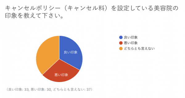キャンセルポリシーを設定している美容院の印象は、“良い印象”が33%、“悪い印象”が30%、“どちらとも言えない”が37%という結果でした。