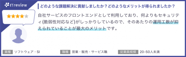 このたび頂戴したユーザ様コメントでは、万全の脆弱性対策で高水準のセキュリティ環境が保持できることで、セキュリティ面での運用工数が削減できる点や、データ抽出などの基本的な操作手順が直感的に分かりやすいことについて、ご評価をいただきました。また当社の強みでもあるサポートでは、画面共有サポートによるスムーズな操作説明が分かりやすく、初心者でも安心して構築を進めることができるとのお声を頂いております。