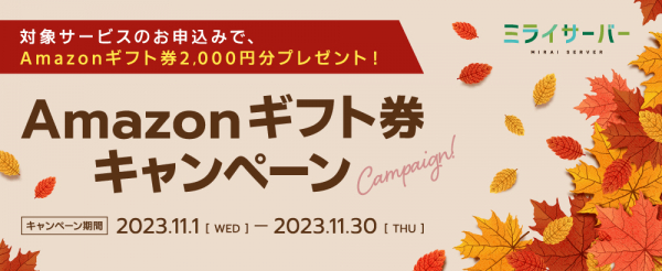 ミライサーバー(運営会社:アシストアップ株式会社、所在地:大阪府大阪市、代表取締役:青木 勝彦)は、2023年11月1日(水)~11月30日(木)の期間、Amazonギフト券キャンペーンを実施いたします。