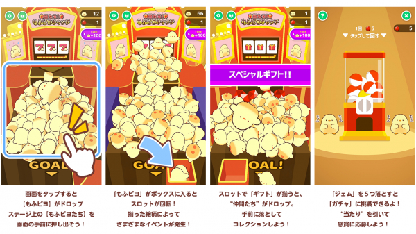 ・「もふピヨ」がボックスに入るとスロットが回転!揃った絵柄によって、さまざまなイベントが発生!