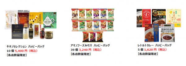 お楽しみハッピーバッグは、「キタノセレクション」、「アマノフーズみそ汁」、「レトルトカレー」の3種類です。キタノセレクション増量商品は、生クリーム入りの生地でこしあんを包んだ「あんどーなつ」、北海道産鮭を使用した「鮭皮チップス」、にんにく特有のにおいが少なく、プルーンのような味わいの「熟成黒にんにくバラタイプ」、北海道産小麦を使用したバラエティにとんだクッキーを詰め込んだ「神戸クッキーアソート」、炭焼きコーヒーを使用したゼリーをオブラートで包んだ「炭焼珈琲ゼリー」、北海道産こんぶ塩を使用し素材の味を引き立てた「焼き塩さば」など、この他、お得な商品を多数取り揃えております。皆様のご来店を心よりお待ちしております。