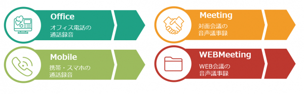 会社の固定電話・携帯/スマートフォン、対面会議、web会議などあらゆるビジネス会話を録音し、クラウド上にて一元管理するシステムです。自動テキスト化機能を備え、統計化・会話解析機能を活用したVOC/トレンド分析や応対品質評価が可能です。