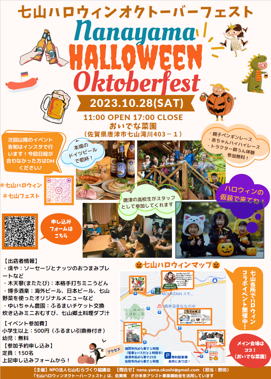 今回が第一回目の開催となる『七山ハロウィンオクトーバーフェスト』は10月28日(土)に開催されます。七山の美しい自然の中で参加して楽しめるイベントや、オクトーバーフェストの名の通り、ドイツをはじめとする海外のビール、日本のビール、そしてお子さんも乾杯に参加できる「こどもビール」もご準備!七山グルメの屋台も立ち、親子で一日楽しめます!