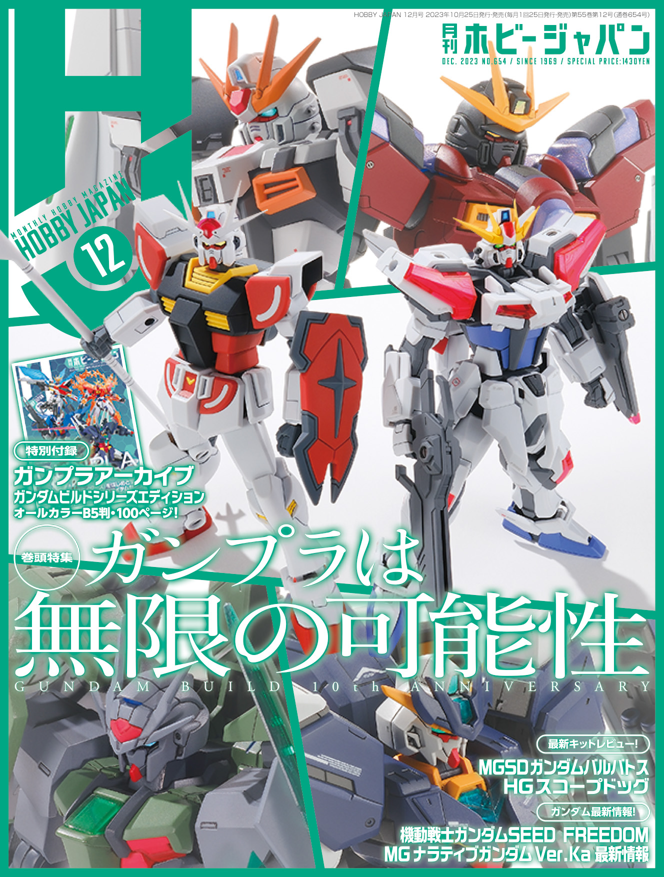 10月25日(水)発売「月刊ホビージャパン 2023年12月号」の特集は「ガンダムビルドシリーズ」!ガンダムビルドシリーズの10周年を記念して、本シリーズならではのガンプラの楽しみ方をお届けしていきます!ガンダムビルドシリーズのアイテムをまとめた別冊付録「ガンプラアーカイブ ガンダムビルドシリーズ エディション」と合わせてお楽しみください!