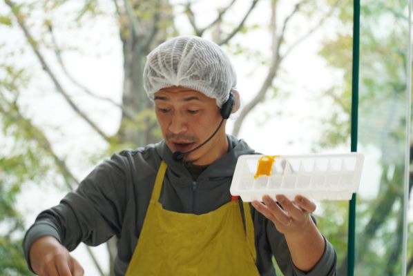 今回のテーマ「パパと一緒に離乳食づくり」について、三児のパパであり、農業・養蜂・介護と幅広く活動中の高橋 裕次郎先生に講義していただきました。今回は、パパが主体となる離乳食作りの講座です。パパに離乳食づくりを体験してもらい、ママ達にその様子を見学してもらいました。