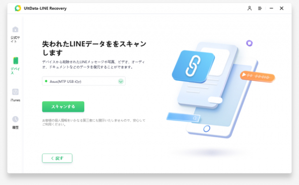 バックアップを取っていない場合でも、UltData LINE Recoveryを使用することでLINEの削除されたメッセージを復元することができます。以下の手順に従ってください。