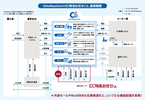 SBSグループ(代表:鎌田正彦、本社:東京都新宿区)は、ECプラットフォームサービス「EC物流お任せくん」において、お客様のOMO(オンラインとオフライン販売の連携)に関する課題を解決し在庫管理を最適化することを目的に、フューチャーアーキテクト株式会社(代表:神宮由紀、本社:東京都品川区)が提供するクラウド型在庫情報共有システム「OmnibusCore(オムニバスコア)」とシステム標準連携することを決定しました。サービスの提供開始は2024年2月を予定しています。