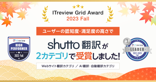 この度、Webサイト翻訳サービス「shutto翻訳」は、アイティクラウド社主催の「ITreview Grid Award 2023 Fall」において、ユーザーから高い評価を受け、Webサイト翻訳カテゴリーで「Leader」を、AI翻訳・自動翻訳(テキスト翻訳)ツールカテゴリーで「High Performer」を受賞しました!Webサイト翻訳カテゴリーについては、19期連続の受賞となります!