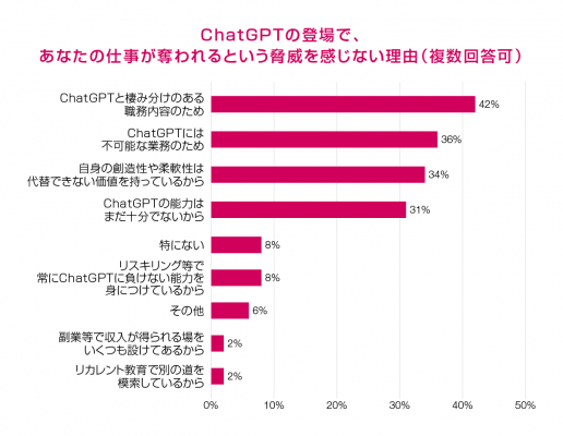 1位「ChatGPTと棲み分けのある職務内容のため」(42%)