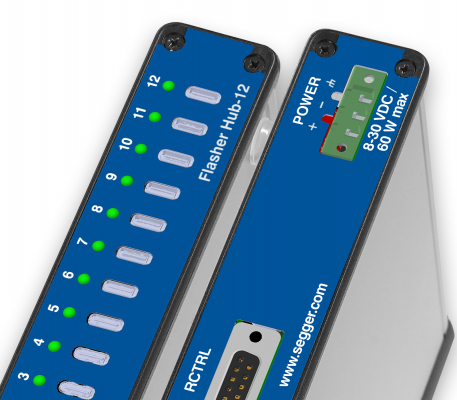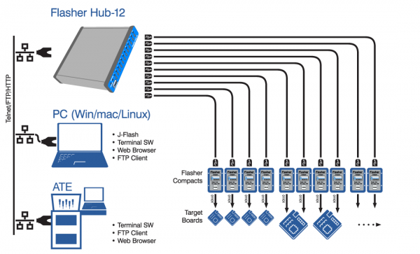 Flasher Hub-12 は、接続された Flasher Compact の管理および制御システムとして機能します。Flasher Hub は、ハンドシェイク ライン、RS232、USB、または統合された Telnet、Web、または FTP サーバーを介して制御および監視できます。ギャング プログラミング システムによってプログラムされた各デバイスには、プログラミング中に個別のシリアル番号や MAC アドレスなどのパッチ、または個別の機能のライセンスを割り当てることができます。
