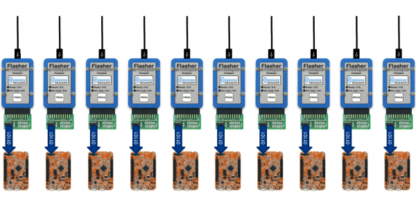 「Flasher Hub-12セットアップでは、各 Flasher Compact をターゲット デバイスのできるだけ近くに配置できます。Flasher Compact とターゲット デバイス間のケーブルを非常に短く保つことで、信頼性が最大化され、可能な限り最高の速度が保証されます。Flasher Compact はスリムで軽量な筐体により、スペース効率が高く、あらゆる生産環境に簡単に統合できます。筐体の設置面積はクレジット カードよりも小さいです。」と SEGGER のマーケティング マネージャーの Dirk Akemann 氏は述べています。