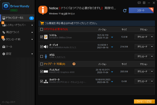 EaseUS DriverHandyは、一括でドライバーを更新、バックアップ、復元できるツールです。Windowsのパソコンやラップトップの各種ドライバーをスキャンし、古い、壊れた、欠落した、不適切なドライバーを検出します。そして、ネットワーク接続がない場合でもオフラインでドライバーをインストールまたは更新できます。