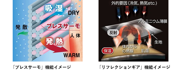 アウターに使用される「リフレクションギア」は、薄い芯地にアルミニウム薄膜をコーティングした素材で、特殊技術加工により、体内からの熱を反射して衣服内の空気を保温します。アルミニウム薄膜はナノレベルの薄さのため、ウエアの風合いも損ないません。