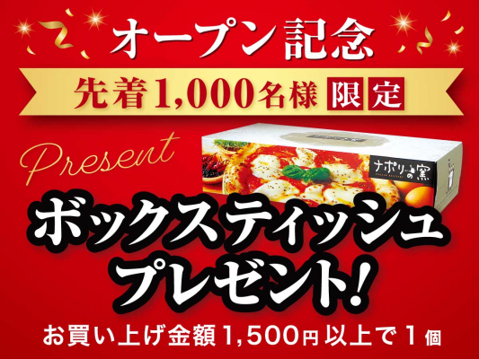 オープン記念といたしまして、先着1,000名様にナポリの窯 ボックスティッシュをプレゼント!