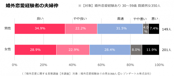 「婚外恋愛をするくらいだから夫婦仲が良くないのだろう」というのが世間一般のイメージかもしれません。少なくとも一般の夫婦よりも「仲が悪い」割合は高そうですが、グラフの結果になりました。