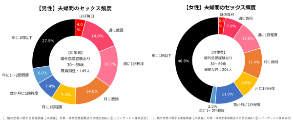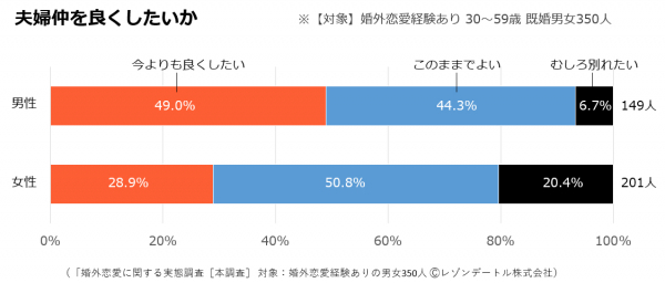 今回は7回に分けて行って参りました「婚外恋愛に関する実態調査」の最終報告です。最後のテーマは「婚外恋愛経験者の夫婦関係」。夫婦仲が良くないから、夜の生活に満足してないから婚外恋愛に走るというのが一般的なイメージですが、果たしてその実態はどうでしょうか。「婚外恋愛経験あり」の既婚男女350人(30~59歳)に「夫婦仲は良いか」「夫婦間のセックス頻度は?」「夫婦仲を良くしたいか?」などを尋ねた結果を分析します。