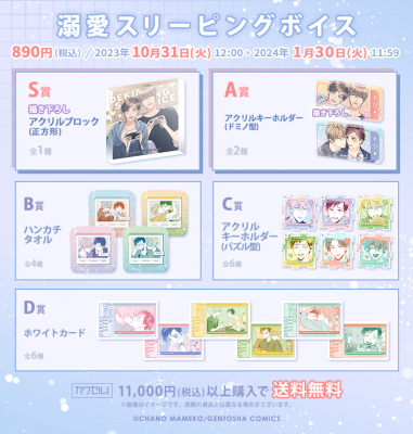 S賞アクリルブロックの、秀一と慧の二人がゲームをしているイラストは「カワセルくじ」限定描き下ろしイラストとなります。グッズはすべてパステル調のデザインで統一されており、秀一と慧の甘い雰囲気を存分にお楽しみいただけるラインナップになります。是非ともくじをお楽しみください!