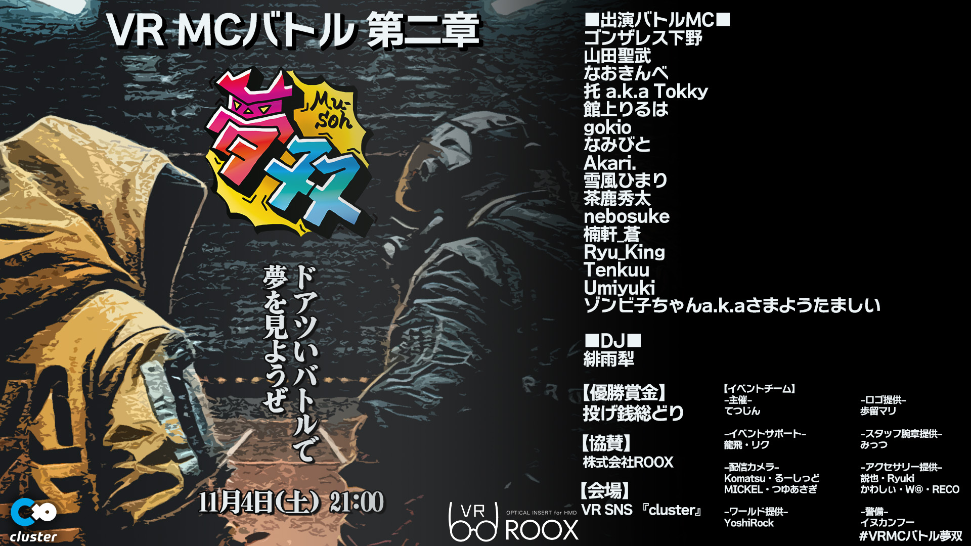 スマートフォンアクセサリー・VR製品の企画・販売を行う株式会社ROOX(本社:東京都豊島区)は、2023年11月4日にcluster上で開催されるラップバトル「VRMCバトル『夢双』」に対し、協賛を行うことを発表いたしました。メタバース上の会場に参加者と観客が集い、熱いMCバトルをくりひろげます。当社は、優勝賞品提供の他、最も熱いバトルをした二人に送られる「ベストバウト賞」の副賞を提供することで協賛するというものです。