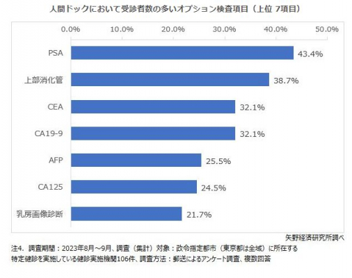 健診施設では、受診者受け入れ拡大のための他施設との差別化ポイントの1つとして、受診者のニーズに対応した人間ドックのオプション検査を導入することで、受診者の獲得を図っているとみられる。本調査に関連し、2023年8~9月に健診実施施設に対して郵送アンケート調査を実施し、106件の回答を得た。