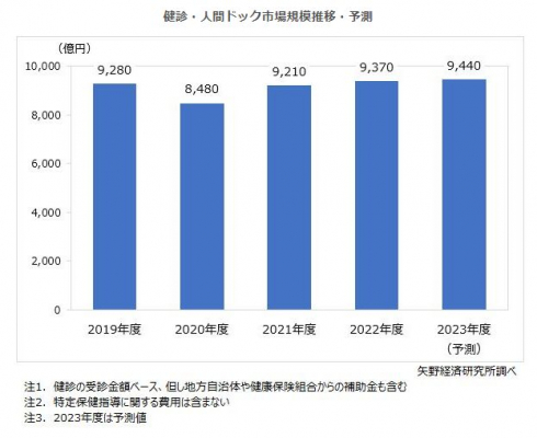 コロナ禍を契機として、より健康・予防に対する人々の意識は高まっており、健診・人間ドック市場への追い風となると考える。市場は以前の様に横ばいまたは微増傾向で推移していく見込みで、2023年度の健診・人間ドック市場は前年度比100.7%の9,440億円になると予測する。
