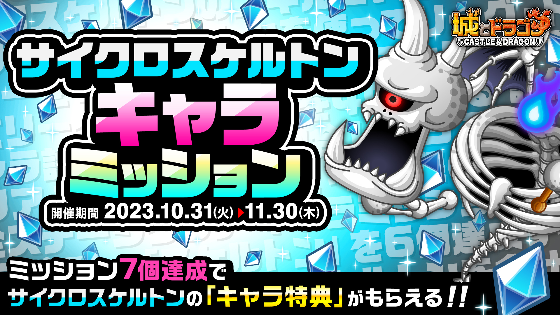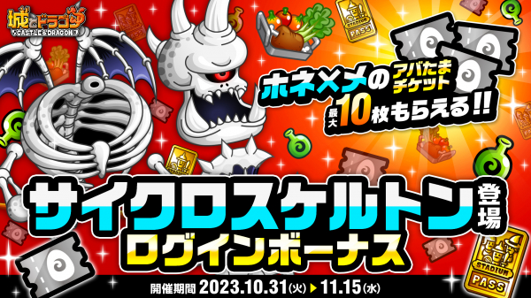 株式会社アソビズム(本社:東京都千代田区、代表取締役:大手智之)は、App Store・Google Playにて配信中の『城とドラゴン』で、「サイクロスケルトン登場ログインボーナス」を2023年10月31日(火)より開催します。