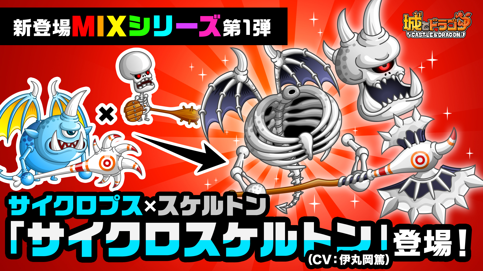 10月31日(火)、“ガールシリーズ”、“転生シリーズ”に続く新たなキャラシリーズとして“MIXシリーズ”が誕生!第1弾として、サイクロプスとスケルトンが合体した「サイクロスケルトン」が「ホネ×メのアバたま」に登場します。MIXシリーズは城ドラ初のスキル2種持ちとなります。