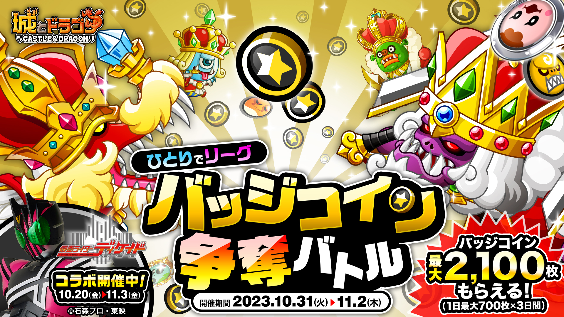 上記期間中“ひとりで”リーグに参加してバトルに勝利すると、報酬として1日5回まで“バッジコイン”が贈られます。1勝につき50枚、5勝目には500枚のバッジコインを必ず獲得できます。