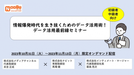 株式会社ナビットが運営するデータ活用なう事務局は、「情報爆発時代を生き抜くためのデータ活用術!データ活用最前線セミナー(3社共催・無料)」を2023年10月31日(火)に配信を開始いたしました。