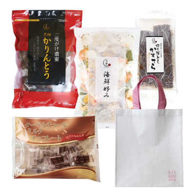 キタノセレクション人気のお菓子4種類をオリジナルエコバッグに詰めました。お正月の団らんにもおすすめのお菓子は会話に花を添えること間違いなし!バッグは軽くて使いやすい素材を使用。グレーにくすみピンクの持ち手がポイントです。