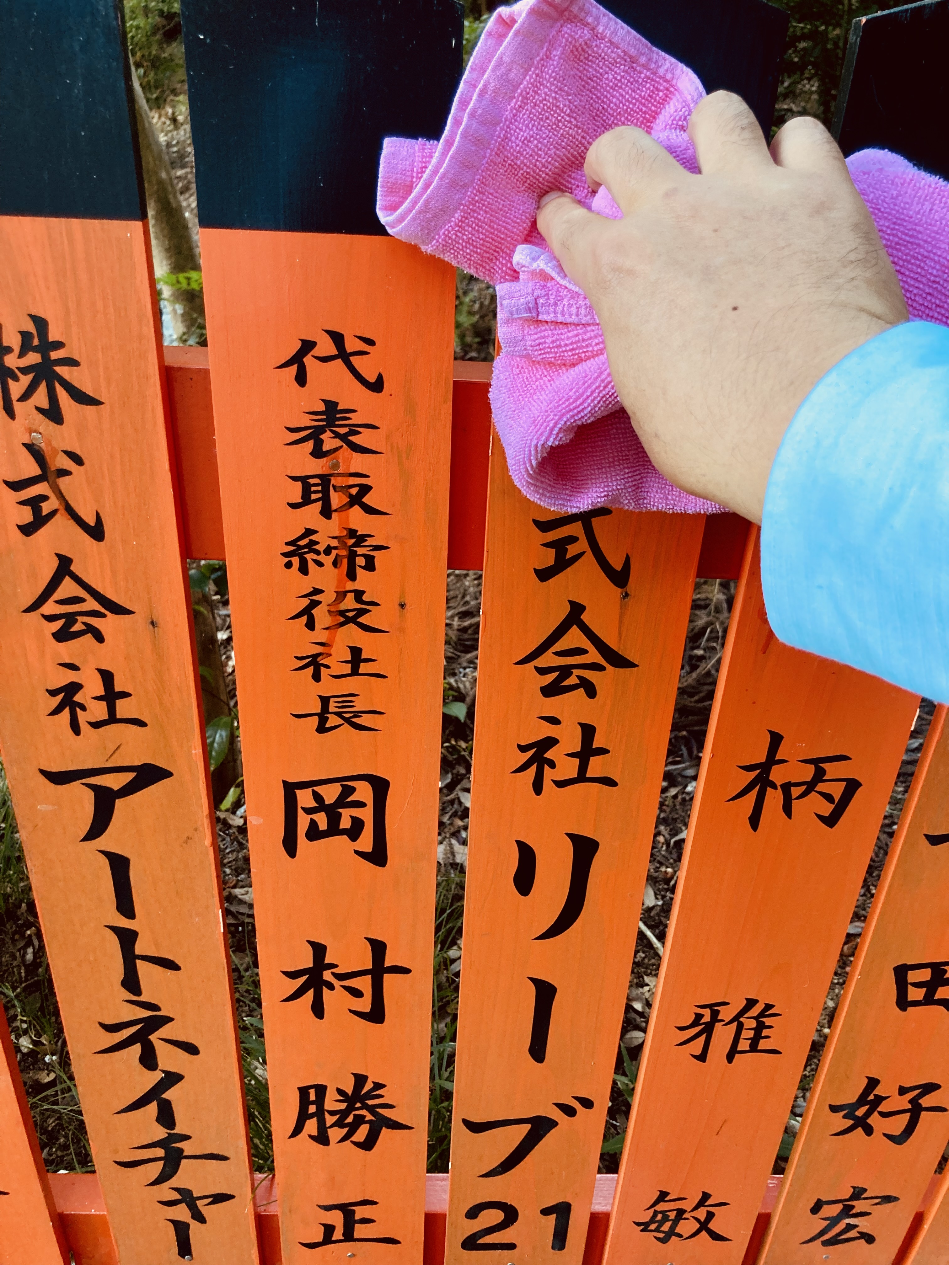 リーブ21も、御髪神社の境内に玉垣を奉納しております。ご参拝の方々が頭髪のご利益を願って、弊社の玉垣を触っておられるそうです。その感謝の意も込めて、境内清掃させていただきました。