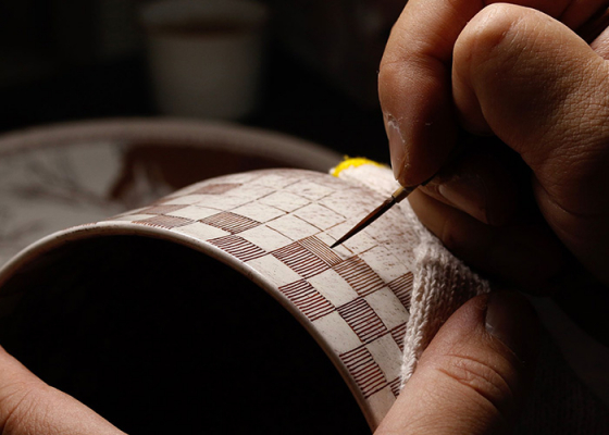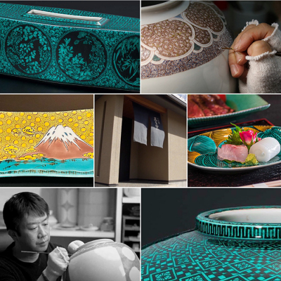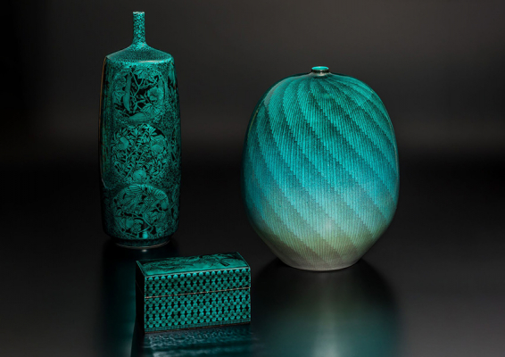 ご子息の雅夫さんは、精緻な呉須の線描と掻き落としで独特な質感の下地を作り、その上に緑釉を塗る「緑彩」をはじめとする技法で、現代の新しい表現に取り組んでいます。近年は、忠夫さんの色絵細描技法の継承にも力を注いでいます。2022年には第4回三井ゴールデン匠賞を受賞。職人・作家としての技術力の高さだけでなく、「本物の九谷焼」を広く知らせる活動から産地全体への貢献度が高く評価されました。