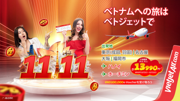 この新路線開設を記念して、ベトジェットは公式ウェブサイト(http://www.vietjetair.com)、ベトジェットエアモバイルアプリにて、2023年11月1日から2023年11月11日までの期間、数百万枚の航空券を片道わずか13,990円(税・サーチャージ込み)からご提供するチケットキャンペーンを実施致します。