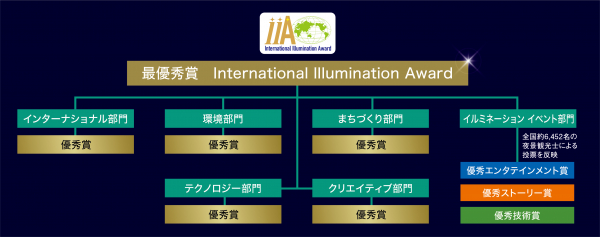 環境部門=イルミネーション業界で環境問題に対して先進的な取り組みを評価。サステナブルや省エネルギーなどの技術的評価、観光施設やイベント主催者だけではなく、明かりに携わる自治体や企業も含まれます。
