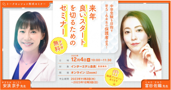 日本最大級の受験教育情報サイト「インターエデュ・ドットコム(本社:東京都新宿区、代表取締役社長:酒井学)は、2023年12月4日(月)に、中学入試を1年後、2年後に控える受験生がこの冬に“ワンステップ”成長できるように、中学受験専門カウンセラーの安浪京子先生と富田佐織先生の最強タッグによるオンラインセミナーを開催します。