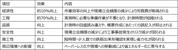 BAIASは、従来技術との比較において、以下のとおり全ての項目(6項目)で活用効果(向上)が認められました。これは、現在「現場側端末1台のみで鉄筋出来形計測を行う技術」としてNETIS登録されている技術(自社調べ:本技術を含む2技術)の中でも唯一であり、利用者にとって非常に有益な技術であることが裏付けられました。